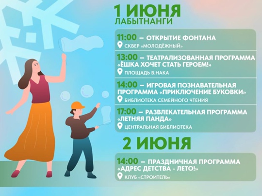 Для маленьких жителей Лабытнанги и Харпа в округе будут организованы яркие и интересные мероприятия. Интерактивные программы, театрализованные представления, творческие мастер-классы и множество сюрпризов ждут вас!